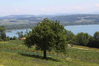 Keywords: switzerland lake region of lake murten water sky nature bank trees murten morat landscape waters view mont vully mountain summer blue sun
