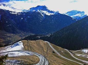 Keywords: switzerland sky clouds mountains ravine valley snow road highway forest trees woods scenic vista nature outside country countryside