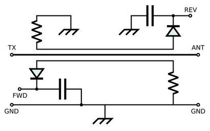 Keywords: SWR Meter.svg SWR meter <br> TX is the input from the transmitter ANT is the antenna connection FWD is the forward wave connection REV is the reflected wave connection GND is the external ground connection own Inductiveload 2009-01-25 SWR meters