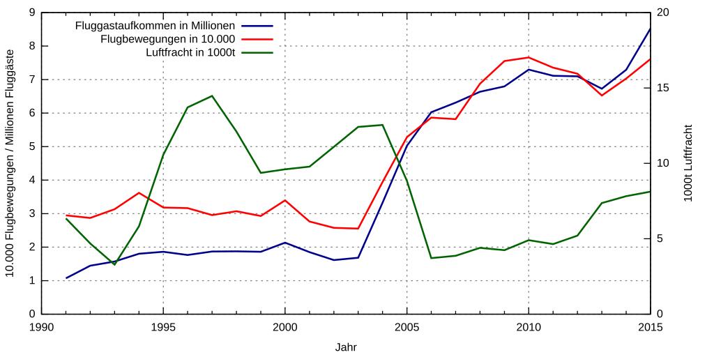 | Keywords: SXF stats.svg en Berlin Schönefeld Airport statistical data de Flughafen Berlin-Schönefeld Verkehrszahlen seit 1991 own ; data from http //www berlin-airport de/DE/UeberUns/Verkehrsstatistik/Monatlich/SXF berlin-airport de Gorgo 2011-02-13 Gnuplot script to generate this plot gnuplot <source lang gnuplot > /usr/bin/gnuplot gnuplot 4 2 / Ubuntu 8 10 input set timefmt Y set datafile separator ; output set key top left set style data lines set grid set xdata time set xlabel 'Jahr' set xrange '1990' '2015' set xtics 157680000 set mxtics 5 set format x ' Y' set ylabel '10 000 Flugbewegungen / Millionen Fluggäste' set ytics nomirror set ytics 1 set yrange 0 9 set y2tics 5 set autoscale y2 set y2range 0 20 set y2label '1000t Luftfracht' set term svg size 800 400 font Arial 10 set output 'SXF_stats svg' plot '-' using 1 2/1000000 title 'Fluggastaufkommen in Millionen' axes x1y1 lt rgb 'dark-blue' lw 2 \ '-' using 1 2/10000 title 'Flugbewegungen in 10 000' axes x1y1 lt rgb 'red' lw 2 \ '-' using 1 2/1000 title 'Luftfracht in 1000t' axes x1y2 lt rgb 'dark-green' lw 2 1991;1069886 1992;1446933 1993;1572361 1994;1804490 1995;1861674 1996;1766452 1997;1870213 1998;1876209 1999;1861385 2000;2133919 2001;1851377 2002;1615171 2003;1684384 2004;3325348 2005;5026115 2006;6026228 2007;6313343 2008;6638162 2009;6797158 2010;7297911 2011;7113989 2012;7097274 2013;6727306 2014;7292517 2015;8526268 e 1991;29472 1992;28723 1993;31334 1994;36185 1995;31827 1996;31649 1997;29563 1998;30711 1999;29304 2000;33947 2001;27635 2002;25755 2003;25549 2004;39420 2005;52852 2006;58647 2007;58198 2008;68771 2009;75538 2010;76595 2011;73577 2012;71758 2013;65268 2014;70325 2015;76153 e 1991;6349 1992;4686 1993;3284 1994;5823 1995;10573 1996;13716 1997;14473 1998;12111 1999;9372 2000;9604 2001;9785 2002;11099 2003;12418 2004;12546 2005;8833 2006;3720 2007;3870 2008;4399 2009;4246 2010;4907 2011;4649 2012;5206 2013;7370 2014;7827 2015;8128 e </source> Cc-zero Berlin Schönefeld Airport Images with Gnuplot source code Airport statistics |