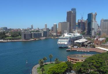 Keywords: sydney australia skyline skyscrapers buildings architecture ship cruise liner sky clouds cityscape urban grass harbor bay water reflections outside shoreline summer spring scenic