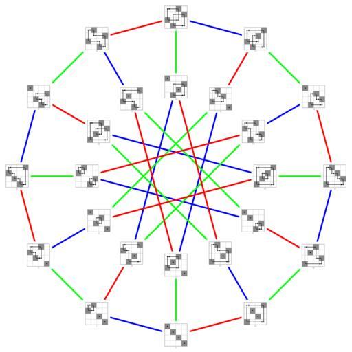 Keywords: Symmetric group 4; Cayley graph 1,5,21 (Nauru Petersen); matrices.svg Cayley graph of S<sub>4</sub> generated by blue 12 green 13 red 14 This is a Nauru graph compare http //11011110 livejournal com/124705 html The many faces of the Nauru graph by 0xDE own v fl mate2code 300px300px Nauru graph 4x4 permutation matrix |
