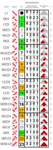 Keywords: Symmetric group 4; permutation list (0-based).svg All permutations of 0 1 2 3 in reverse colexicographic order Columns cycle notation permutation matrix active right row number of A055089 factorial number converted to decimal <small>if the permutation is not self-conjugate the number of its inverse is shown below</small> one-line notation<small> reflected factorial number below</small> inversion set inversion number A034968 digit sum of factorial number and cardinality of inversion set List of the first 8 4320 permutations of 8 elements in the same order https //oeis org/A198380/a198380_1 txt own Watchduck other versions with permutations of 1 2 3 4 File Symmetric group 4; permutation list svg Other fields I + Symmetric group S4; white green and orange wgo Little-endian factorial numbers Inversion set of a 4-element permutation Colexicographic order 24×4 matrices Permutation matrix; active right |