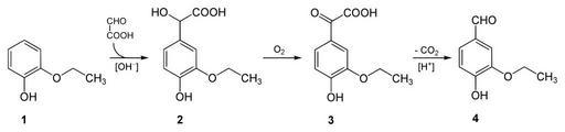 | Keywords: Synthesis Ethylvanillin.svg en synthesis of ethylvanillin 2-Ethoxyphenol 1 + glyoxylic acid -> 3-Ethoxy-p-hydroxymandelic acid 2 -> 3 -> ethylvanillin 4 de Darstellung von Ethylvanillin 2-Ethoxyphenol 1 + Glyoxylsäure -> 3-Ethoxy-p-hydroxymandelsäure 2 -> -> Ethylvanillin 4 own Yikrazuul 10 03 2010 Ethylvanillin Chemical syntheses |