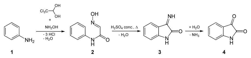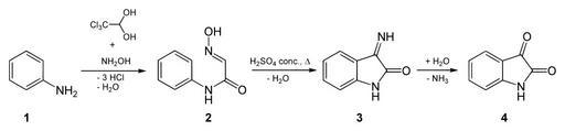 Keywords: Synthesis Isatin 2.svg Synthese von Isatin nach Sandmeyer de Synthesis of isatin according to Sandmeyer en Own 12 05 08 Yikrazuul Chemical reactions Isatin