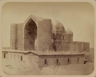 | Keywords: Syr Darya Oblast. City of Turkestan. General View of Sultan Akhmed Yassavi's Mausoleum from the Southern Side. WDL2468.png Artwork ru Сы да ьинская область Го од Ту кестан Общий вид мавзолея Султана Ахмеда Яссави с южной сто оны fr Syr Darya Oblast Ville de Turkestan Vue d'ensemble du mausolée du Sultan Akhmed Yassavi près de la rive sud en Syr Darya Oblast City of Turkestan General View of Sultan Akhmed Yassavi's Mausoleum from the Southern Side zh 锡尔河 区 其斯 市 苏尔 艾哈迈德亚萨维陵墓南侧视角全景图 pt Syr Darya Oblast Cidade do Turquistão Vista geral do Mausoléu do Sultão Akhmed Yassavi do lado sul ar منطقة سير داريا مدينة تركستان منظر عام لضريح السلطان أحمد ياسافي من الجهة الجنوبية ru Эта фотог афия мавзолея Ходжи Ахмеда Ясави в го оде Ту кестан анее Яси д евней столице казахов включена в <i> Ту кестанский альбом </i>один из богатейших источников наглядной инфо мации о культу ных памятниках С едней Азии в том виде как они существовали вXIX веке ноготомное издание было выпущено в 1871-1872 годах под пат онажем Константина П фон Кауфмана гене ала усской а мии кото ый был пе вым гене ал-губе нато ом Ту кестана как назывались в то в емя владения Российской импе ии в С едней Азии Кауфман оставался гене ал-губе нато ом с 1867 по 1886 год и сыг ал значительную оль в деле ук епления домини ующей позиции России в Цент альной Азии С еди главных фотог афов-составителей <i> Ту кестанского альбома </i> Ходжа Ахмед 1103-1066 гг был п ославленным суфистским духовным лиде ом и поэтом кото ый п еподавал в Яси Хотя до сме ти Таме лана в 1405 году ст оительство не было заве шено аботы возобновились в конце XVI века и куполооб азное ст оение сох анилось до нашего в емени как один из лучших п име ов тиму идской а хитекту ы В 2002 году мавзолей был внесен в список Всеми ного наследия Ю ЕСКО <br>Исламская а хитекту а; Ясави Ахмед уме в 1166 г ; Фотог афические исследования; огильные памятники; Г обницы fr Cette photographie du mausolée de Khoja Ahmed Yasawi dans la ville de Turkestan auparavant Yasi ancienne capitale du Kazakhstan provient de l' <i>Album du Turkestan</i> l'une des sources les plus riches d'information visuelle sur les monuments culturels d'Asie centrale au 19ème siècle Cette édition comprenant plusieurs volumes a été réalisée en 1871-72 sous le patronage de P Konstantin von Kaufman général de l'armée russe et premier gouverneur général du Turkestan ainsi que les possessions d'Asie Centrale étaient nommées par l'Empire russe En poste de 1867 à 1886 Kaufman a joué un rôle majeur dans le renforcement des positions russes en Asie centrale Les premiers à avoir travaillé sur la compilation photographique de <i>l'Album du Turkestan</i> furent Aleksandr L Kun 1840-88 un orientaliste appartenant à l'armée et Nikolai V Khoja Ahmed 1103-66 était un célèbre chef spirituel soufi et poète qui a enseigné dans la ville de Yasi En 1389 le grand Tamerlan a ordonné aux grands maîtres persans de construire un immense mausolée sur le site d'inhumation du saint Bien qu'inachevé au moment de la mort du souverain en 1405 les travaux ont repris à la fin du 16ème siècle et la structure en dôme demeure comme l'un des meilleurs exemples de l'architecture Timuride En 2002 le mausolée a été inscrit au Patrimoine mondial de l'UNESCO <br>Architecture islamique; I͡Asavi Akhmed mort en 1166; Inventaires photographiques; Monuments funéraires; Tombes en This photograph of the mausoleum of Khoja Ahmed Yasawi in the city of Turkestan formerly Yasi ancient capital of the Kazakhs is contained in <em>Turkestan Album</em> one of the richest sources of visual information on the cultural monuments of Central Asia as they appeared in the 19th century The multi-volume edition was produced in 1871-72 under the patronage of Konstantin P von Kaufman a Russian army general and the first governor-general of Turkestan as the Russian empire's Central Asian holdings were called Kaufman held that position from 1867 to 1886 during which time he played a major role in establishing Russia's dominant position in Central Asia The primary photographic compilers for the <em>Turkestan Album</em> were Aleksandr L Kun 1840-88 an orientalist attached to the army and Nikolai V Bogaevskii 1843-1912 a military engineer Khoja Ahmed 1103-66 was a renowned Sufi spiritual leader and poet who taught in the city of Yasi In 1389 the great Tamerlane commissioned Persian masters to build a vast mausoleum over the saint's burial site Although uncompleted at the time of the ruler's death in 1405 work resumed in the late 16th century and the domed structure has survived as one of the best examples of Timurid architecture In 2002 the mausoleum was designated a UNESCO World Heritage Site <br>Islamic architecture; I͡Asavi Akhmed died 1166; Photographic surveys; Sepulchral monuments; Tombs zh 这张照片是位于突厥斯 市(前亚
