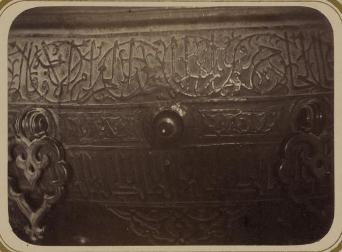 Keywords: Syr-Darya Oblast. City of Turkestan. Beginning of the Inscription Bordering the Exterior of the Cauldron Located in the Tomb of Saint Sultan Akhmed Iassavi WDL3595.png Artwork ru Богаевский иколай Владими ович 1843 1912 гг fr Bogaevskii Nikolaï V 1843-1912 en Bogaevskii Nikolai V 1843-1912 zh 亚历山大·L· ,1840-1888 年 pt Bogaevskii Nikolai V 1843-1912 ar بوغافسكي، نيكولاي ف ، 1843-1912 es Bogaevskii Nikolai V 1843-1912 ru Сы да ьинская область Го од Ту кестан ачало надписи окаймляющей на ужную сто ону котла находящегося в г обнице святого султана Ахмеда Яссави fr Oblast de Syr-Darya Ville de Turkestan Début de l'inscription bordant l'extérieur du chaudron situé dans le sépulcre du vénérable sultan Akhmed Iassavi en Syr-Darya Oblast City of Turkestan Beginning of the Inscription Bordering the Exterior of the Cauldron Located in the Tomb of Saint Sultan Akhmed Iassavi zh 锡尔河 区 其斯 市 苏尔 ·艾哈迈德·亚萨维墓 内的大锅 外表环绕的铭文 头部分 pt Oblast de Sir Dária Cidade do Turquestão Início da inscrição que rodeia o exterior da pia ritual localizada no túmulo do santo sultão Ahmed Iassavi ar منطقة سير داريا مدينة تُرْكِستان بداية النقش الذي يُؤطِّر الجزء الخارجي للميضأة الموجودة في ضريح الولي سلطان أحمد يسوي ru Эта фотог афия элемента итуальной чаши для воды внут и мавзолея Ходжи Ахмеда Ясави в Яси сов еменный Ту кестан Казахстан соде жится в а хеологической части <em> Ту кестанского альбома </em> Шеститомное фотог афическое исследование было подготовлено и издано в 1871 1872 гг под пат онажем гене ала Константина П  фон Кауфмана пе вого гене ал-губе нато а 1867 1882 гг Ту кестана как называли в то в емя те ито ию Цент альной Азии п инадлежавшую Российской импе ии Яси ассоции уется с суфийским мистиком Ходжой Ахмедом Ясави 1103 1066 гг великая слава кото ого побудила Тиму а Таме лана пост оить мемо иальную г обницу <em>ханаку</em> на месте его захо онения авзолею пост оенному в 1396 1398 гг п исущи ха акте ные че ты тиму идской а хитекту ы в то в емя пе еживавшей свой асцвет в Сама канде а снимке видна часть большой б онзовой итуальной чаши для воды; в надписи на чаше указано что она была поже твована Тиму ом Чаша ук ашена изысканными ботаническими фигу ами и пе сидско-а абскими надписями аве ху находится полоса с надписью выполненной письмом насх и пе еплетающейся с узо ом из завитков Под полосой видны деко ативные б онзовые элементы и еще одна надпись угловатыми буквами а езной пове хности в нижней части фотог афии видна а абеска Высота чаши составляет около одного мет а <br>Котлы; адписи; Ясави Ахмед уме в 1166 г ; Фотог афические исследования; П едметы елигиозного назначения; огильные памятники; Г обницы fr Cette photographie d'un détail du bassin dédié aux ablutions rituelles du mausolée de Khodzha Akhmed Iassavi à Yasi au Turkestan actuel Kazakhstan est extraite de l'ouvrage archéologique <em>Album du Turkestan</em> Cet inventaire photographique en six volumes fut réalisé entre 1871 et 1872 sous le patronage du général Konstantin P von Kaufman premier gouverneur général 1867-1882 du Turkestan nom donné aux territoires d'Asie centrale de l'Empire russe La ville de Yasi est associée au mystique soufi Khodzha Akhmed Iassavi 1103-1166 dont la renommée était telle que Tamerlan fit construire un sanctuaire commémoratif <em>khanaka</em> sur le site de sa tombe Bâti de 1396 à 1398 le mausolée présente les caractéristiques de l'architecture timuride en pleine apogée à Samarcande à cette époque Cette vue partielle du grand bassin dédié aux ablutions rituelles montre l'inscription indiquant qu'il fut donné par Tamerlan Le bassin est richement décoré de figures à fleurs et d'inscriptions perso-arabes Dans la partie supérieure de la photographie une bande d'inscription en écriture naskhi entrelacée de motifs de vrilles apparaît Des armatures décoratives en bronze et une autre inscription avec des lettres angulaires sont visibles sous cette bande Au bas de la photographie la surface bombée est ornée d'une arabesque Le bassin mesure environ un mètre de hauteur <br>Chaudrons; Inscriptions; I͡Asavi Akhmed mort en 1166; Inventaires photographiques; Articles religieux; Monuments funéraires; Tombes en This photograph of a detail of a ritual basin in the interior of the mausoleum of Khodzha Akhmed Iassavi in Yasi present-day Turkestan Kazakhstan is from the archeological part of <em>Turkestan Album</em> The six-volume photographic survey was produced in 1871-72 under the patronage of General Konstantin P von Kaufman the first governor-general