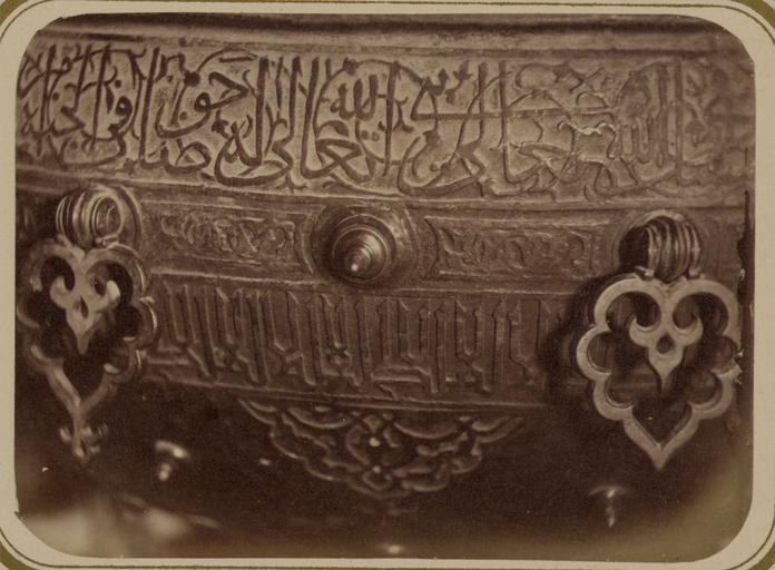 Keywords: Syr-Darya Oblast. City of Turkestan. Beginning of the Inscription Bordering the Exterior of the Cauldron Located in the Tomb of Saint Sultan Akhmed Iassavi WDL3597.png Artwork ru Богаевский иколай Владими ович 1843 1912 гг fr Bogaevskii Nikolaï V 1843-1912 en Bogaevskii Nikolai V 1843-1912 zh 亚历山大·L· ,1840-1888 年 pt Bogaevskii Nikolai V 1843-1912 ar بوغافسكي، نيكولاي ف ، 1843-1912 es Bogaevskii Nikolai V 1843-1912 ru Сы да ьинская область Го од Ту кестан ачало надписи окаймляющей на ужную сто ону котла находящегося в г обнице святого султана Ахмеда Яссави fr Oblast de Syr-Darya Ville de Turkestan Début de l'inscription bordant l'extérieur du chaudron situé dans le sépulcre du vénérable sultan Akhmed Iassavi en Syr-Darya Oblast City of Turkestan Beginning of the Inscription Bordering the Exterior of the Cauldron Located in the Tomb of Saint Sultan Akhmed Iassavi zh 锡尔河 区 其斯 市 苏尔 ·艾哈迈德·亚萨维墓 内的大锅 外表环绕的铭文 头部分 pt Oblast de Sir Dária Cidade do Turquestão Início da inscrição que rodeia o exterior da pia ritual localizada no túmulo do santo sultão Ahmed Iassavi ar منطقة سير داريا مدينة تُرْكِستان بداية النقش الذي يُؤطِّر الجزء الخارجي للميضأة الموجودة في ضريح الولي سلطان أحمد يسوي ru Эта фотог афия элемента итуальной чаши для воды внут и мавзолея Ходжи Ахмеда Ясави в Яси сов еменный Ту кестан Казахстан соде жится в а хеологической части <em> Ту кестанского альбома </em> Шеститомное фотог афическое исследование было подготовлено и издано в 1871 1872 гг под пат онажем гене ала Константина П  фон Кауфмана пе вого гене ал-губе нато а 1867 1882 гг Ту кестана как называли в то в емя те ито ию Цент альной Азии п инадлежавшую Российской импе ии Яси ассоции уется с суфийским мистиком Ходжой Ахмедом Ясави 1103 1066 гг великая слава кото ого побудила Тиму а Таме лана пост оить мемо иальную г обницу <em>ханаку</em> на месте его захо онения авзолею пост оенному в 1396 1398 гг п исущи ха акте ные че ты тиму идской а хитекту ы в то в емя пе еживавшей свой асцвет в Сама канде а снимке видна часть большой б онзовой итуальной чаши для воды; в надписи на чаше указано что она была поже твована Тиму ом Чаша ук ашена изысканными ботаническими фигу ами и пе сидско-а абскими надписями аве ху находится начало полосы с надписью выполненной письмом насх и пе еплетающейся с узо ом из завитков Под полосой видны деко ативные б онзовые элементы и еще две полосы с надписями угловатыми буквами а езной пове хности в нижней части фотог афии видна а абеска Высота чаши составляет около одного мет а <br>Котлы; адписи; Ясави Ахмед уме в 1166 г ; Фотог афические исследования; П едметы елигиозного назначения; огильные памятники; Г обницы fr Cette photographie d'un détail du bassin dédié aux ablutions rituelles du mausolée de Khodzha Akhmed Iassavi à Yasi au Turkestan actuel Kazakhstan est extraite de l'ouvrage archéologique <em>Album du Turkestan</em> Cet inventaire photographique en six volumes fut réalisé entre 1871 et 1872 sous le patronage du général Konstantin P von Kaufman premier gouverneur général 1867-1882 du Turkestan nom donné aux territoires d'Asie centrale de l'Empire russe La ville de Yasi est associée au mystique soufi Khodzha Akhmed Iassavi 1103-1166 dont la renommée était telle que Tamerlan fit construire un sanctuaire commémoratif <em>khanaka</em> sur le site de sa tombe Bâti de 1396 à 1398 le mausolée présente les caractéristiques de l'architecture timuride en pleine apogée à Samarcande à cette époque Cette vue partielle du grand bassin dédié aux ablutions rituelles montre l'inscription indiquant qu'il fut donné par Tamerlan Le bassin est richement décoré de figures à fleurs et d'inscriptions perso-arabes Dans la partie supérieure de la photographie le début d'une bande d'inscription en écriture naskhi entrelacée de motifs de vrilles apparaît Des armatures décoratives en bronze et deux autres bandes d'inscription avec des lettres angulaires sont visibles sous cette bande Au bas de la photographie la surface bombée est ornée d'une arabesque Le bassin mesure environ un mètre de hauteur <br>Chaudrons; Inscriptions; I͡Asavi Akhmed mort en 1166; Inventaires photographiques; Articles religieux; Monuments funéraires; Tombes en This photograph of a detail of a ritual basin in the interior of the mausoleum of Khodzha Akhmed Iassavi in Yasi present-day Turkestan Kazakhstan is from the archeological part of <em>Turkestan Album</em> The six-volume photographic survey was produced in 1871-72 under the patronage of Gene