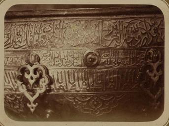 | Keywords: Syr-Darya Oblast. City of Turkestan. Mosque of Saint Sultan Akhmed Iassavi. End of the Inscription WDL3876.png Artwork ru Богаевский иколай Владими ович 1843 1912 гг fr Bogaevskii Nikolaï V 1843-1912 en Bogaevskii Nikolai V 1843-1912 zh 亚历山大·L· ,1840-1888 年 pt Bogaevskii Nikolai V 1843-1912 ar بوغافسكي، نيكولاي ف ، 1843-1912 es Bogaevskii Nikolai V 1843-1912 ru Сы да ьинская область Го од Ту кестан ечеть святого Султана Ахмеда Ясави Конец надписи fr Oblast de Syr-Darya Ville de Turkestan Mosquée du sultan Akhmed Iassavi Fin de l'inscription en Syr-Darya Oblast City of Turkestan Mosque of Saint Sultan Akhmed Iassavi End of the Inscription zh 锡尔河 区 其斯 市 苏尔 ·艾哈迈德·亚萨维清 寺 铭文的结尾部分 pt Oblast de Sir Dária Cidade do Turquestão Mesquita do santo sultão Ahmed Iassavi Parte final da inscrição ar منطقة سير-داريا مدينة تُرْكِستان مسجد الولي سلطان أحمد يسوي الجزء الأخير من النقش ru Эта фотог афия элемента итуальной чаши для воды внут и мавзолея Ходжи Ахмеда Ясави в Яси сов еменный Ту кестан Казахстан соде жится в а хеологической части <em> Ту кестанского альбома </em> Шеститомное фотог афическое исследование было подготовлено и издано в 1871 1872 гг под пат онажем гене ала Константина П фон Кауфмана пе вого гене ал-губе нато а 1867 1882 гг Ту кестана как называли в то в емя те ито ию Цент альной Азии п инадлежавшую Российской импе ии Яси ассоции уется с суфийским мистиком Ходжой Ахмедом Ясави 1103 1066 гг великая слава кото ого побудила Тиму а Таме лана пост оить мемо иальную г обницу <em>ханаку</em> на месте его захо онения авзолею пост оенному в 1396 1398 гг п исущи ха акте ные че ты тиму идской а хитекту ы в то в емя пе еживавшей свой асцвет в Сама канде а фотог афии видна часть большой б онзовой итуальной чаши для воды; в надписи на чаше указано что она была поже твована Тиму ом Чаша ук ашена изысканными ботаническими фигу ами и пе сидско-а абскими надписями аве ху находится конец полосы с надписью выполненной письмом насх и пе еплетающейся с узо ом из завитков Под полосой видны деко ативные б онзовые элементы и еще две полосы с надписями угловатыми буквами а езной пове хности в нижней части фотог афии видна а абеска Высота чаши составляет около одного мет а <br>Котлы; адписи; Ясави Ахмед уме в 1166 г ; Фотог афические исследования; П едметы елигиозного назначения; огильные памятники; Г обницы fr Cette photographie d'un détail du bassin dédié aux ablutions rituelles du mausolée de Khodzha Akhmed Iassavi à Yasi au Turkestan actuel Kazakhstan est extraite de l'ouvrage archéologique <em>Album du Turkestan</em> Cet inventaire photographique en six volumes fut réalisé entre 1871 et 1872 sous le patronage du général Konstantin P von Kaufman premier gouverneur général 1867-1882 du Turkestan nom donné aux territoires d'Asie centrale de l'Empire russe La ville de Yasi est associée au mystique soufi Khodzha Akhmed Iassavi 1103-1166 dont la renommée était telle que Tamerlan fit construire un sanctuaire commémoratif <em>khanaka</em> sur le site de sa tombe Bâti de 1396 à 1398 le mausolée présente les caractéristiques de l'architecture timuride en pleine apogée à Samarcande à cette époque Cette vue partielle du grand bassin dédié aux ablutions rituelles montre l'inscription indiquant qu'il fut donné par Tamerlan Le bassin est richement décoré de figures à fleurs et d'inscriptions perso-arabes La fin d'une bande d'inscription en écriture naskh entrelacée de motifs de vrilles apparaît dans la partie supérieure de la photographie Des armatures décoratives en bronze et deux autres bandes d'inscription avec des lettres angulaires sont visibles sous cette bande Au bas de la photographie la surface bombée est ornée d'une arabesque Le bassin mesure environ un mètre de hauteur <br>Chaudrons; Inscriptions; I͡Asavi Akhmed mort en 1166; Inventaires photographiques; Articles religieux; Monuments funéraires; Tombes en This photograph of a detail of a ritual basin in the interior of the mausoleum of Khodzha Akhmed Iassavi in Yasi present-day Turkestan Kazakhstan is from the archeological part of <em>Turkestan Album</em> The six-volume photographic survey was produced in 1871-72 under the patronage of General Konstantin P von Kaufman the first governor-general 1867-82 of Turkestan as the Russian Empire s Central Asian territories were called Yasi is associated with the Sufi mystic Khodzha Akhmed Iassavi 1103-66 whose great reputation led Timur Tamerlane to construct a memorial shrine <em>khanaka</em> at his grave site Built in 1396-98 the mausoleum displays features of Timurid architecture then at its height in Samarka