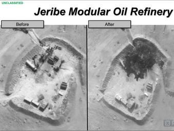 | Keywords: SyrianOilRefineryStrikesRADM Jeribe Modular Oil Refinery (Sep. 2014).jpg Slide presentation from Department of Defense Press Briefing by Rear Adm Kirby in the Pentagon Briefing Room Fighter aircraft from Saudi Arabia United Arab Emirates and the United States attacked modular oil refineries in eastern Syria controlled by the Islamic State of Iraq and the Levant Sept 25 2014 http //www defense gov/Transcripts/Transcript aspx TranscriptID 5506 http //www defense gov/pubs/140925SyrianOilRefineryStrikesRADM pdf 2014-09-25 DoD graphic Operation Inherent Resolve Maps of the Syrian Civil War 2011-present Maps of ongoing conflicts PD-USGov |
