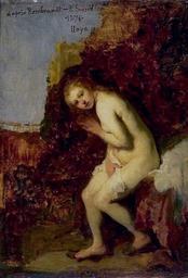 | Keywords: Szyndler Susanna at her bath.jpg Artwork Creator Pantaleon Szyndler after 1876 oil canvas cm 46 5 33 Institution National Museum Warsaw Not on view accession number MP 730 object history credit line d'après Rembrandt - P Szyndler / 1876 / Haye caption/signature/date/location upper left Copy of a painting in the Mauritshuis http //cyfrowe mnw art pl/dmuseion/docmetadata id 16650 show_nav true cyfrowe mnw art pl See below PD-old-100 DEFAULTSORT 1876; Susanna at her bath Copies of paintings by Rembrandt Paintings by Pantaleon Szyndler in the National Museum in Warsaw Susanna and the Elders by Rembrandt 1876 paintings Women facing left in art |