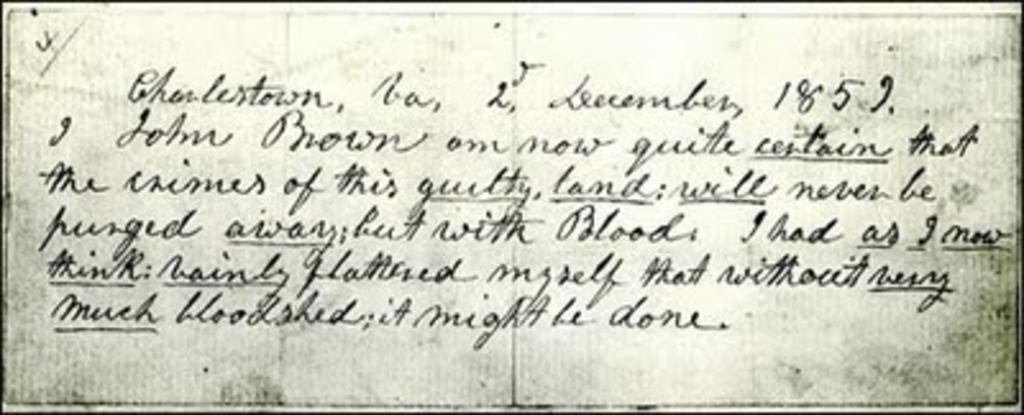 | Keywords: T-john-brown-last-prophecy.jpg On the day of his execution December 2 1859 John Brown wrote his last prophecy which said I John Brown am now quite certain that the crimes of this guilty land will never be purged away; but with Blood I had as I now think vainly flattered myself that without very much bloodshed; it might be done http //blogs venturacountystar com/foothill/ 1859-12-02 John Brown Template PD-old John Brown's raid on Harpers Ferry | ||||