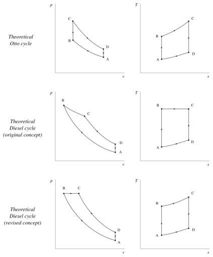| Keywords: T-s and p-v diagrams for Otto and Diesel cycles.svg en Temperature-entropy and pressure-volume charts comparing the Otto cycle top the original Diesel cycle as first presented by Rudolf Diesel middle and the revised Diesel cycle bottom Typically the compression ratio in Diesel cycle is much higher than in Otto cycles 2014 own Olivier Cleynen other versions cc-zero SVG physics Uploaded with UploadWizard Temperature-entropy diagrams Pressure-volume diagrams Otto cycle Diesel cycle | ||||