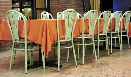 Keywords: table freely empty chairs restaurant local hard drive cloth green orange