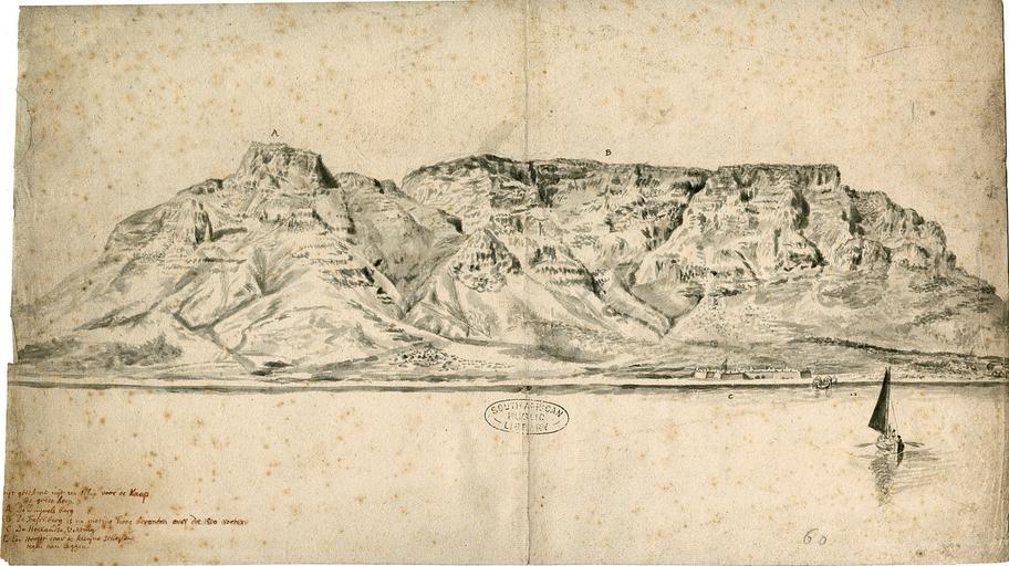 | Keywords: Table Mountain WDL11260.png Artwork ru Столовая го а fr Montagne de la Table en Table Mountain zh 桌山 pt Montanha da Mesa ar جبل الطاولة ru Это изоб ажение Столовой го ы Кейптаун Южная Аф ика входит в коллекцию из 27 исунков на 15 листах обна уженных в 1986 г в ациональной библиотеке Южной Аф ики Ценность этих исунков заключается в том что они соде жат самые анние еалистичные изоб ажения п едставителей на одности кой-коин ко енных жителей Западно-Капской п овинции Данный исунок возможно сделанный с бо та ко абля ставшего на яко ь возле Роббенэйланда п едставляет собой одно из наиболее точных изоб ажений Столовой бухты того пе иода В нижнем левом углу п иведен коммента ий на голландском языке поясняющий условные буквенные обозначения на исунке A Пик дьявола B По езультатам изме ений высота Столовой го ы составила более 1800 футов voeten C Голландский фо т D Пи с возле кото ого может п ишва товаться небольшое судно По всей ве оятности исунки выполнены одившимся в XVII веке голландцем кото ый по оду деятельности был связан с Голландской Ост-Индской компанией а возле ыса Доб ой адежды оказался по пути в Голландскую Ост-Индию или об атно в иде ланды Есть основания полагать что названные исунки были созданы не позднее 1713 г а быть может и го аздо аньше Большинство из них соде жат п имечания добавленные после 1730 г д угим человеком имя кото ого также остается неизвестным <br>Лодки и п огулки на лодках; ыс Доб ой адежды; К епости и фо тификационные соо ужения; иде ланды - Колонии; Столовая бухта Южная Аф ика ; Столовая го а Западно-Капская п овинция Южная Аф ика fr Cette vue de la montagne de la Table Le Cap en Afrique du Sud fait partie d un ensemble de 27 dessins sur 15 feuilles qui a été découvert à la Bibliothèque nationale d Afrique du Sud en 1986 L importance des dessins réside dans l illustration des premières représentations réalistes des Khoïkhoï les premiers habitants du Cap-Occidental Ce dessin réalisé probablement à partir d un bateau amarré au large de Robben Island est l un des rendus les plus précis de la baie de la Table datant de cette période Les lettres du dessin sont liées aux notes en néerlandais figurant dans la partie inférieure gauche du dessin Elles indiquent « A La montagne du Diable B Après mesure l'altitude de la montagne de la Table est de 549 mètres C Le fort hollandais D Une jetée où de petites embarcations peuvent s amarrer » L artiste était fort probablement un Néerlandais né au XVII e siècle qui occupait une certaine fonction à la Compagnie néerlandaise des Indes orientales Il se dirigeait vraisemblablement vers les Indes orientales néerlandaises ou rentrait aux Pays-Bas quand il a visité le Cap Des indications laissent à supposer que les dessins ont été réalisés au plus tard en 1713 et probablement même beaucoup plus tôt La plupart des dessins portent des annotations faites après 1730 par une autre personne elle aussi non identifiée <br>Bateaux et canotage; Cap de Bonne-Espérance; Forts et fortifications; Pays-Bas--Colonies; Baie de la Table Afrique du Sud ; Montagne de la Table Cap-Occidental en Afrique du Sud en This view of Table Mountain Cape Town South Africa is from a set of 27 drawings on 15 sheets that was discovered in the National Library of South Africa in 1986 The drawings are important for presenting the earliest realistic depictions of the Khoikhoi the original inhabitants of the Western Cape This drawing probably made from a ship moored off Robben Island is one of the most accurate renderings of Table Bay from this period The notes at the lower left in Dutch are keyed to the letters on the drawing and read A The Devil s mountain B Table Mountain has been found after measurement to be more than 1800 feet <em>voeten</em> high C The Dutch fort D A pier where small craft may moor up The artist most likely was a Dutchman born in the 17th century who was attached in some capacity to the Dutch East India Company and possibly en route to the Dutch East Indies or on his way back to the Netherlands when he visited the Cape Evidence suggests that the drawings were made no later than 1713 and possibly a good deal earlier Most of the drawings have annotations made by another person also unidentified after 1730 <br>Boats and boating; Cape of Good Hope; Forts and fortifications; Netherlands--Colonies; Table Bay South Africa ; Table Mountain Western Cape South Africa zh 这张桌山(南 普敦)的图片出自 组画 15 页纸上的 27 张图画,于 1986 年 南 国家图书馆被发现 这些图画属于重要资料,是 早描绘西 普 原住民科伊科伊族 实生活的素描 这幅画可能是 艘 泊 罗 岛旁的船上画的,是这 时 描绘桌湾 精确的图画之 左下角的注释是荷兰文,解释了图上的字母标志,内容是: A 魔鬼山;B 
