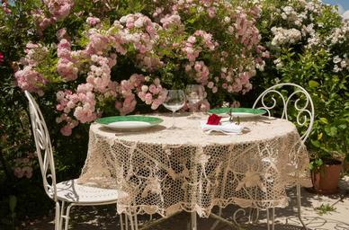Keywords: table summer invitation tablecloth relaxation roses sun terrace plates wine glasses chairs flowers