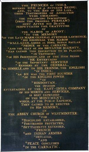 | Keywords: Tablet 2 LawrenceTower HaldonHouse Devon.PNG en Biographical tablet 2 of 3 dedicated to General Stringer Lawrence 1697-1775 erected on the Haldon estate in 1788 together with the Lawrence Tower alias Haldon Belvedere in which it is housed in his memory by his friend Sir Robert Palk 1st Baronet 1717-1798 of Haldon House Dunchideock Devon Text The princes of India revered him as a superior being and to the end of his life their testimonies of affection were unceasing The following inscription from the original Persian sent after his death perpetuates the gratitude of the Nabob of Arcot To the memory of the late Major-General Stringer Lawrence His Highness the Nabob Wallajah Ameer Al Hind Sepah Saular Prince of the Carnatic and ally of His Britannic Majesty has caused this inscription to be placed in testimony of his friendship and of the high sense he entertains of the important services rendered by the General to himself and to his friends the English in India As he was the first founder of the English power in Hindostan the opinion entertained by the East-India Company of his merits and services is best expressed on the monument which at the public expence they caused to be erected to his memory in the Abbey Church of Westminster For Discipline Established Fortresses Protected Settlements Extended French and Indian Armies Defeated and Peace Concluded in the Carnatic own photo Lobsterthermidor <span class signature-talk ></span> 13 41 2 August 2015 UTC 2015 Haldon Belvedere |
