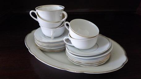 Keywords: tableware porcelain gold edge white t dowry coffee service stack