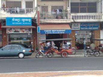 | Keywords: Taboo restaurant phnom penh 01032011075.jpg en Taboo Restaurant and shops offering full body massage on Sisowath Quay Phnom Penh Cambodia 1 March 2011 2011-03-01 own Dtfman cc-zero Uploaded with UploadWizard Phnom Penh Restaurants in Cambodia Shops in Cambodia Motorcycle towed trailers Massage parlours |