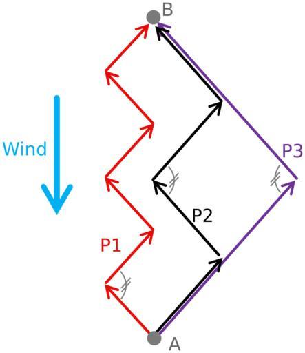 | Keywords: Tacking Intervals.svg en Schematic showing different paths of a vessel beating against the wind A vessel sailing against the wind from A to B can tack using different sized intervals taking e g the paths P1 P2 or P3 while travelling the same overall distance In a narrow channel path P1 can be necessary while in open water P3 may be preferable because it requires fewer turns In all cases the vessel will sail as close to the wind as possible Jibing_Intervals_2 jpg 2011-07-25 09 21 UTC Jibing_Intervals_2 jpg Lindert derivative work Gregors <span class signature-talk >talk</span> 09 22 25 July 2011 UTC Redraw of pixel jpg image as vector svg Gregors Jibing_Intervals_2 jpg in-image interferes with image reuse </nowiki> 2010-03-17T23 40 22Z Lindert 965x628 176877 Bytes <nowiki> own Lindert 2010-03-18 </nowiki> Uploaded with derivativeFX Sailing manoeuvres Sailing diagrams |