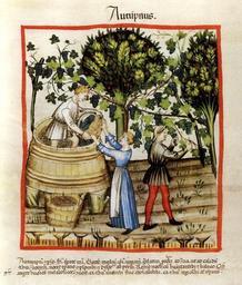 | Keywords: Tacuin Automne03.jpg Weinlese im Herbstbild Autumpnus des Tacuinum Sanitatis fol 54 verso Codex Vindobonensis Series nova 2644 Österreichische Nationalbibliothek Nach Ibn Botlans Text ist der Herbst gemäßigt kalt im zweiten Grad Zu bevorzugen sei seine Mitte und am besten wandelt er sich stufenweise etwa zu kalt und feucht Er schadet Menschen mit gemäßigter Kompexion und schwächlichen Naturen Dagegen helfen Bäder Der Herbst fördert darüber hinaus die Schwermut Er nützt Personen mit warmer und feuchter Komplexion Jugendlichen und Kindern in warmen und feuchten Gegenden Nach anderer Ansicht in gemäßigten Breiten en Autumn Autumpnus Nature Moderately cold in the second degree Optimum Its central period Usefulness when one proceeds gradually toward opposites ar for example toward warmth and dampness Dangers It is harmful to moderate temperatures and to those predisposed toward consumption Neutralization of the Dangers By the application of moist elements and with baths Effects Increases melancholy humors It is suitable to warm and damp temperaments to the young and adolescent in warm and damp regions or in temperate areas fr Automne Autumpnus Nature Assez froid dans au second degré Optimum Sa période centrale Usage lorsque l'on évolue graduellement vers les contraires par exemple vers la chaleur et l'humidité Dangers Il est dangereux aux températures modérées et pour ceux qui prédisposés à la consomption Neutralisation des dangers par l'application d ™Ã©léments humides et par des bains Effets Accroît l ™humeur mélancolique Il est adapté aux tempéraments chauds et humides aux jeunes et aux adolescents au temps des régions chaudes et humides ou dans les zones tempérées Tacuinum sanitatis in medicina Codex Vindobonensis Series nova 2644 der Österreichischen Nationalbibliothek Graz Akademische und Druck- und Verlagsanstalt 2004 ISBN 3-201-01831-7 Scan von Schutzumschlag Kommentar von Franz Unterkircher S 92 author ~ 1390 PD-old-100 Vintage in art Autumn in art People with grapes in art Wine presses in art 14th-century fashion Tacuinum sanitatis Cod Vindob ser nov 2644 History of wine Grape treading |