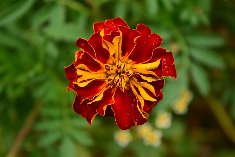 Keywords: tagete marigold blossom bloom flower plant nature yellow red red and yellow close wet drip drop of water bright beautiful greeting card