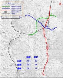 | Keywords: Taichung MRT Lines Planned in 1998.png zh 1997年,臺灣 政 完成 臺中都 捷運路網細部規劃 ,規劃 紅 藍 綠三 路線 臺中都 大 捷運系統後續路網檢討公聽 簡報 臺北市政 捷運工程 2009-05-19 PD-ROC-exempt Department of Rapid Transit Systems Taipei City Government Taiwan Provincial Government Taichung MRT |