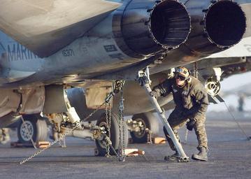 | Keywords: Tail hook detail.jpg A Marine assigned to the Silver Eagles of Marine Strike Fighter Attack Squadron One One Five VMFA-115 conducts a preflight check on the tailhook on one of the squadron ™s F/A-18A+ Hornets 050124-N-4308O-018 Persian Gulf Jan 24 2005 - A Marine assigned to the Silver Eagles of Marine Strike Fighter Attack Squadron One One Five VMFA-115 conducts a preflight check on the tailhook on one of the squadron ™s F/A-18A+ Hornets prior to the start of flight operations on the flight deck of the Nimitz-class aircraft carrier USS Harry S Truman CVN 75 Carrier Air Wing Three CVW-3 is embarked aboard Harry S Truman and is providing close air support and conducting intelligence surveillance and reconnaissance missions over Iraq The Truman Carrier Strike Group and CVW-3 are on a regularly scheduled deployment in support of the Global War on Terrorism U S Navy photo by Photographer ™s Mate Airman Ryan O'Connor RELEASED Airplane Serial 163171 Code VE-210 Type F/A-18A CN 611/A517 Unit VMFA-115 source http //www scramble nl/usnbase htm Photographer ™s Mate Airman Ryan O'Connor RELEASED Original from http //www news navy mil/view_single asp id 21270 PD_USN Tail hooks aircraft F/A-18A Hornet Taken with Nikon D1X |