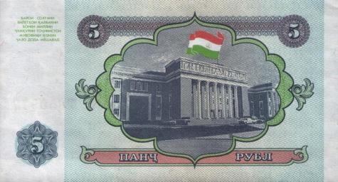| Keywords: Tajikistan-1994-Bill-5-Reverse.jpg 5 таджикских ублей 1994 Цвет - как у пяти ублей СССР 1991 г 5 roubles of Tajikistan 1994 own scan 1994 ациональный банк Таджикистана National Bank of Tajikistan Бонки миллии Тоҷикистон PD-TJ-exempt banknotes Banknotes of Tajikistan 1994 Banknotes with a face value of 5 Blue banknotes |