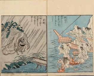 | Keywords: Takehara Shunsensai, Tokaen Michimaro, Picture Book of a Hundred Tales (Ehon hyaku monogatari), vol. 2, 1841.jpg A raccoon-dog with tanuki with his giant scrotum and the boat ghosts fune yūrei from Picture Book of a Hundred Tales Ehon hyaku monogatari vol 1 written by Tōkaen Michimaro 桃花 三千麿 fl 1808 1841 and illustrated by Takehara Shunsensai 1841 Honolulu Museum of Art accession TD 2013-02-073b Honolulu Museum of Art 1841 Takehara Shunsensai 竹原春泉斎 active c early 19th century PD-old-100 Ehon in the Honolulu Museum of Art Shunsensai Ehon Hyaku Monogatari Funayurei Tanuki |
