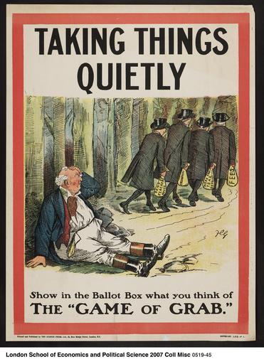 | Keywords: COLL MISC 0519-045 Small poster showing John Bull resting against a tree in a wood, having been assaulted and robbed by unidentified men dressed in black frock coats and top hats. The men are carrying bags called Rent of Teachers House, Endowment, Wear and Tear Repairs, and Fees. Conservative and Unionist poster. COLL MISC 0519-045 Small poster showing John Bull resting against a tree in a wood, having been assaulted and robbed by unidentified men dressed in black frock coats and top hats. The men are carrying bags called Rent of Teachers House, Endowment, Wear and Tear Repairs, and Fees. Conservative and Unionist poster. |