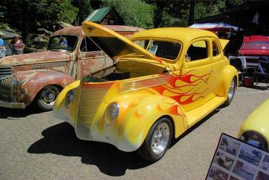 Keywords: talahi car show shaver lake yellow car flames auto vehicle automobile white red wheel transportation tire design automotive power orange
