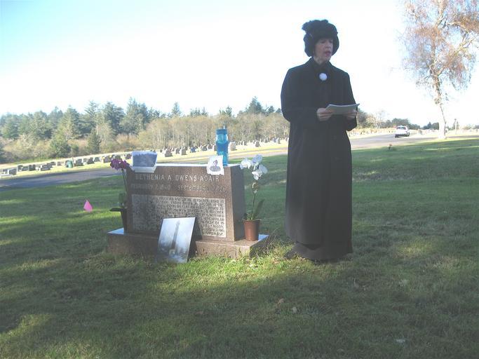 MAKE A MEME View Large Image ...Ann Hope portraying Dr. Bethenia Owens-Adair at the 2013 Talking Tombstones X, Don't Take Them for Granite event held at the Ocean View Cemetery in Warrenton, Oregon October 27, 2013. ShawnAnn Hope portraying Dr. Bethenia Owens-Adair at the ...