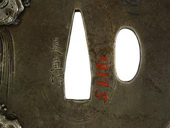 | Keywords: Tamagawa Yoshiharu - Tsuba with an Immortal with His Tiger - Walters 51181 - Mark.jpg On the right side of this tsuba is a Chinese immortal standing with a tiger It is either Bukan Ch Fung Gan who would ride his tiger around his monastery to shock others or the Taoist sage Koreijin Ch Gu Lingren who is accompanied by his white tiger Tigers are said to turn white when they reach the age of five hundred years The tiger demonstrates the power of sage's wisdom because he was able to tame such a strong animal On the left is a bamboo grove middle Other date century 19 late Edo-Meiji silver cm 6 9 6 6 0 42 accession number 51 181 2352 Henry Walters Baltimore date and mode of acquisition unknown Walters Art Museum Henry Walters Acquired by Henry Walters Signature Yoshiharu saku; Translation Made by Yoshiharu place of origin Edo present-day Tokyo Japan Walters Art Museum license Tsuba in the Walters Art Museum Tamagawa Yoshiharu Media contributed by the Walters Art Museum needs category review |