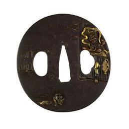 | Keywords: Tamura Tadayuki - Tsuba with a Gate Guardian at Todaiji - Walters 51239.jpg The large figure on the right of the tsuba is one of the paired guardians ni-ô who guard the main south gate at Buddhist temples in Japan These fierce looking figures protect temples from evil spirits In front of the statue is a pilgirm At the lower left is another pilgrim with his staff and hat laying near him On the reverse is a man crawling through a hole in a pillar This reveals that the temple is Todaiji in Nara The pillar is in the Great Buddha Hall and the hole is said to be the size of the nostrils of the Buddha statue The statue itself is forty nine feet high Those who successfully pass through the hole in the pillar are believed to gain enlightenment in their next life ca 1800 Edo iron gold silver copper cm 6 9 6 58 0 47 accession number 51 239 34271 Henry Walters Baltimore date and mode of acquisition unknown Walters Art Museum Henry Walters Acquired by Henry Walters Signature Tadayuki place of origin Japan Walters Art Museum license Tsuba in the Walters Art Museum Tamura Tadayuki Media contributed by the Walters Art Museum needs category review |