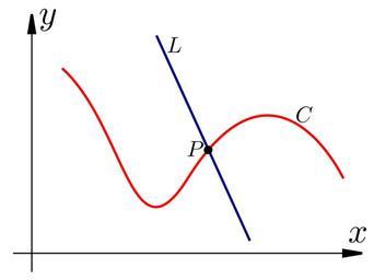 Keywords: Tangency Example 1.svg A diagram showing a curve C red a line L blue and the point of intersection point P black The line intersects the curve but is not a tangent to it Self-made Inkscape 2007-10-23 Inductiveload differential calculus