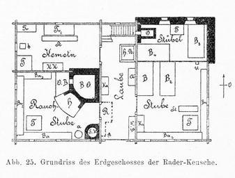 | Keywords: Tangern Dorfplatz 03 1902 b.jpg Plan des Erdgeschosses der Rader Keusche im Jahre 1902 in Tangern am Millstätter Berg Hochplateau über dem Millstättersee / Gemeinde Seeboden in Kärnten / Österreich / Europäische Union Diese Abbildung stammt aus dem Beitrag von J R Bünker in Ödenburg Das Bauernhaus am Millstätter See in Kärnten Wien 1902 Sonderdruck aus Band XXXII Der dritten Folge Band II der žMittheilungen der Anthropologischen Gesellschaft in Wien Seite 48 Dieses Haus im Jahre 2009 Grundriss des Holzhauses im Jahre 1900 gezeichnet von Johann Reinhard Bünker žLaube - Vorhaus; žH B - Hackblock; žA - Ã…lma Kasten mit Fächern; žKa - Kleiderkasten Kasten; žW B - Wasserbank zum Abstellen von Gefäßen mit Wasser; žRauch-Stube - Küche mit offenem Feuer mit sechs kleinen Fenster; žT - Tisch; žBa / Ba2 / Ba3 - Bänke entlang der Fenster; žO -B - Ofenbank; žS -K - Saufutterkessel für Schweinefutterbereitung; ža - KÃ¥sp'lfÃ¥ss Spülicht für Speisereste; žKemeten - Kamma'le kleine Kammer Arbeits- Zimmer mit zwei Fenster; žK K - Speis'kast'l Küchenkasten; žTr / Tr2 - Truhen; žSt - Stuhl; žb - ein Loch im hölzernen Fußboden durch das im Herbst Rüben und Kartoffeln in den darunterliegenden Keller geworfen wurden; žStube - Kachelstube früher mit Ofen großes Zimmer; žB / B2 / B3 / B4 - Betten; žU - Uhr; žStübel - hintare Stib'l; žO - gemauerter Ofen; žStube und žStübel waren ursprünglich ein Raum Schlafordnung um 1900 Der 17jährige Sohn und sein Vater schliefen im Stübel in B3 Ebenfalls dort in B4 schliefen Mutter und die 21jährige Tochter In B in der Stube schlief die Großmutter in B2 der Großvater mit dem 6jährigen Enkel Floor plan of the Rader Keusche a old farm house in 1902 of a former wheelwrighter in Tangern near lake Millstatt Millstätter See community of Seeboden / Spittal an der Drau / Carinthia / Austria / EU A very good example of a preserved almost unchanged Carinthia Small Farm Here is the wooden house in its present state in 2009 Layout of the house in 1900 drawn by Johann Reinhard Bünker Laube - lobby; žH B - chopping block; žA - Ã…lma small wooden box with compartments; žW B - Water bank stand with the parking of water vessels; žRauch-Stube - kitchen with open fire with six small windows; žT - Desk; žBa / Ba2 / Ba3 - Benches along the window; žO -B - Bench by the stove; žS -K - Boiler for the preparation of food for the pigs; ža - swill for leftovers; žKemeten - small chamber working room with two windows; žK K - food box; žTr / Tr2 - chests; žSt - chair; žb - a hole in the wooden floor which are thrown by the turnips and potatoes into the underlying basement; žStube - Furnace room formerly with oven large room; žB / B2 / B3 / B4 - beds; žU - clock; žStübel - rear small room; žO - brick oven; žStube and žStübel was originally a room that is now separated by a wooden wall Sleeping arrangements in 1900 The 17 year old son and his father slept in the bed in Stübel B3 Also there in B4 sleeping mother and 21 year old daughter O In the room bed B the grandmother was asleep with his grandfather in B2 of the 6 year old grandson own summer 1902 scan 21 06 2012 scan and upload by Joadl User Joadl/Ref2 Pd-old Johann Reinhard Bünker Bauernhaus am Millstätter See 1902 Rader Tangern Seeboden Floor plans of Carinthia Tangern Seeboden Floor plans of houses Photographs taken on 2012-06-21 Files by User Joadl Scanned with Epson Perfection V500 Office Scanner |