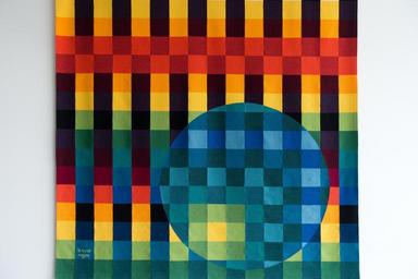 Keywords: tapestry square district yellow orange green blue turquoise black color gradation abstract background about structure pattern form artists herbert baker creativity geometry composition chromatic