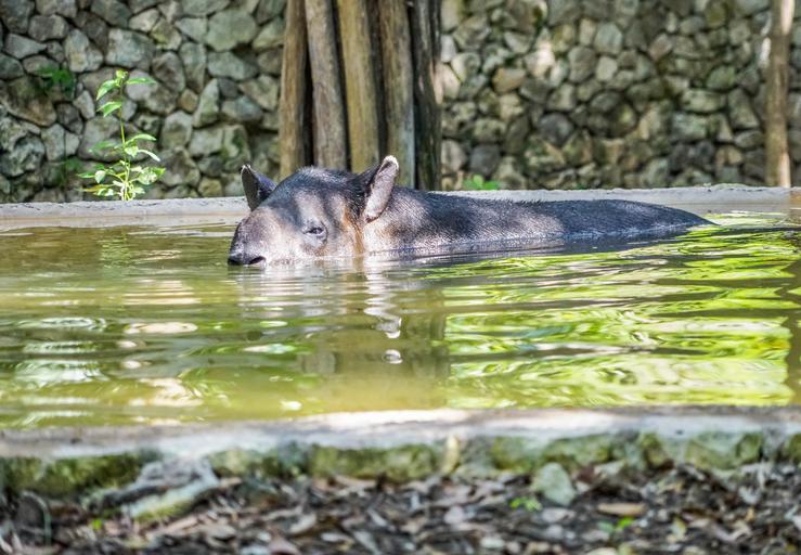 Keywords: tapir snout face swimming water nature animal pool exotic rocks tropical