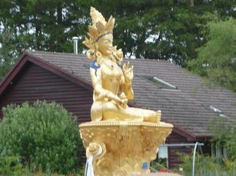 Keywords: Tara garden 01.jpg Kagyu Samyé Ling Monastery and Tibetan Centre at Eskdalemuir Dumfries and Galloway Scotland Own Immanuel Giel 2009 Kagyu Samyé Ling Sculpture of Green Tara blurry