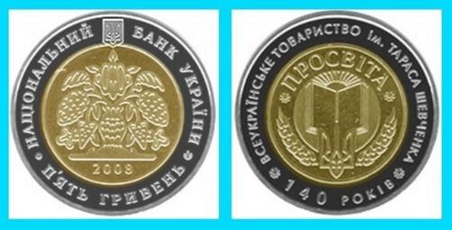 | Keywords: Taras Shevchenko Coins-140 years.jpg en Coins with Taras Shevchenko name <br/>Coin left On the obverse within the central circle there is depicted the tree of life as an ornamental pattern with the year of issue there under; above there is the Small National Emblem of Ukraine; on the ring there is the circumferential inscription АЦІО АЛЬ ИЙ БА К УКРАЇ И П ЯТЬ ГРИВЕ Ь National Bank of Ukraine Five hryvnias Coin right On the reverse there are the emblem of the All-Ukrainian Prosvita Enlightenment Society and the circumferential inscription ВСЕУКРАЇ СЬКЕ ТОВАРИСТВО І ТАРАСА ШЕВЧЕ КА 140 РОКІВ All-Ukrainian Society named after Taras Shevchenko 140 years National Bank Banknotes and Coins Commemorative and jubilee coins http //www bank gov ua/Engl/Bank_coin/YUV_MON/THEME htm Others Labberté K J 2009-04-06 Coins of Ukraine 2008 Taras Shevchenko on coins Images from bank gov ua |