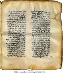 | Keywords: Targum.jpg The Schøyen Collection MS 206 Oslo and London Hebrew square book script Iraq 1st half of 11th c MS in Hebrew and Aramaic on vellum Iraq first half of 11th c 8 ff 39x33 cm 2 columns 25x25 cm 23 lines in a large Hebrew square book script by a scribe perhaps originating from the Maghreb North Africa probably Tunisia Provenance 1 The Genizah of a Kurdistan Jewish community North Iraq until 1950/59 ; 2 Dr Fischel U S A from 1950/59 ; 3 Bernard Rosenthal San Francisco Commentary The Aramaic translation is verse by verse Among the earliest group of surviving Hebrew targum Bible MSS in codex form Exhibited XVI Congress of the International Organization for the study of the Old Testament Library of Law Faculty University of Oslo 29 July - 7 August 1998 Elizabeth G Sørenssen Jingru Høivik photography and formatting The text covers Exodus 12 25-31 beginning in Hebrew with the second word The first word is the end of the Aramaic Targum of v 24; The Targum of v 31 is not complete presumably continuing on the next page PD-art Targum individual images History of North Africa 11th-century manuscripts Hebrew writing Aramaic language Hebrew Bible manuscripts Hebrew calligraphy Jews of Kurdistan Schoyen Collection Artworks missing infobox template |