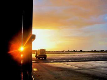 Keywords: tarmac hanger door airfield airport sunset glow