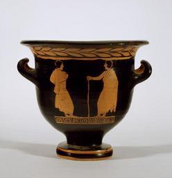 | Keywords: Tarporley Painter - Red-Figure Bell Krater with Satyr and Maenad - Walters 482760 - Side B.jpg Scenes related to the wine-god Dionysus are appropriate for kraters as these vessels were used to mix wine and water Here an old satyr hands a cup to a maenad wearing a short dress and an animal skin-clothing normally associated with the goddess Artemis or an Amazon On the opposite side two youths in mantles are engaged in conversation The Tarporley Painter is named after the previous owner of one of the vases he created He is the most important painter to work in the early plain style of Apulian vase painting The bell krater was his favorite vase shape and Dionysiac themes are common in his work ca 380 BC Classical terracotta cm 49 5 29 8 accession number 48 2760 7369 Münzen und Medaillen A G Basel Switzerland Marilyn and Herbert Scher Pikesville Maryland June 29 1983 by purchase Walters Art Museum Gift of Marilyn and Herbert Scher 2003 place of origin Apulia Italy Walters Art Museum license Ancient Greek red-figure pottery in the Walters Art Museum Tarporley Painter Media contributed by the Walters Art Museum needs category review Media contributed by the Walters Art Museum needs artist update Ancient Greek pottery from Italy |
