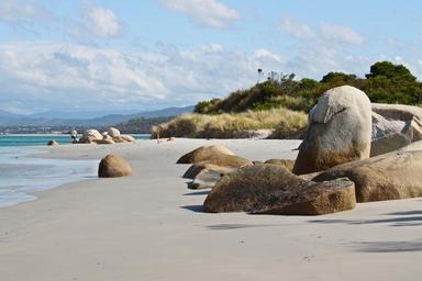 Keywords: tasmania beach rock australia coast landscape nature sand water scenic vacation coastline sunny grass nobody shore blue scenery peaceful sea clouds