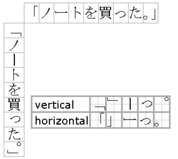 | Keywords: Tateyoko.png en ノートを買った -- I bought a notebook/notebooks <br>Horizontal and vertical writing in Japanese Some characters take different presentation forms in horizontal and vertical writing modes Also a typical example of mixtures of horizontal and vertical formats that require large blank space p ro ノートを買った -- Nōto o katta -- Cumpăr caiet e <br>Diagramă ilustrând diferențele în plasarea semnelor de punctuație dintre scrierea japoneză verticală și cea orizontală într-o propoziție care conține caractere hiragana katakana și kanji 2006-02-18 own User Nanshu thumb left 150px RO svg Nanshu en Original upload log en wikipedia FtCG page en wikipedia Tateyoko png wikitable - 22 02 18 May 2010 335 × 300 3 444 bytes Beao w en <nowiki> </nowiki> - 21 53 18 February 2006 335 × 300 3 343 bytes Nanshu w en <nowiki> ノートを買った -- I bought a notebook/notebooks Horizontal and vertical writing in Japanese Some characters take different presentation forms in horizontal and vertical writing modes Also a typical example of mixtures </nowiki> Japanese writing Japanese vertical writing |