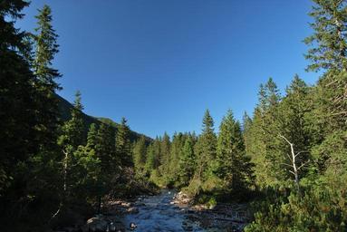 Keywords: tatry polish tatras the high tatras spruce tree coniferous green blue sky water stream torrent
