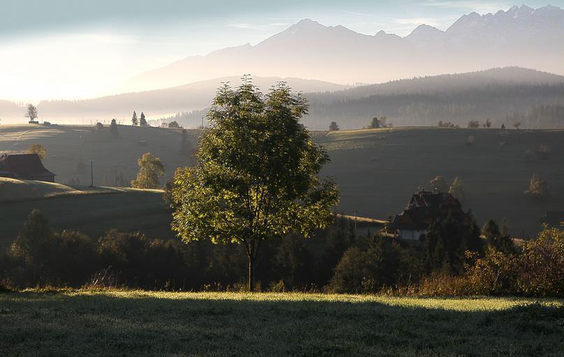 Keywords: tatry sunrise dawn polish tatras morning tree nature mist the fog haze hill pogórze podhale the purity of the the freshness autumn morning mist the beginning of the day cool morning in the morning