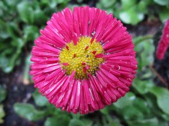 Keywords: tausendschön daisy red daisy flower red blossom bloom nature garden red flower spring rain wet cold
