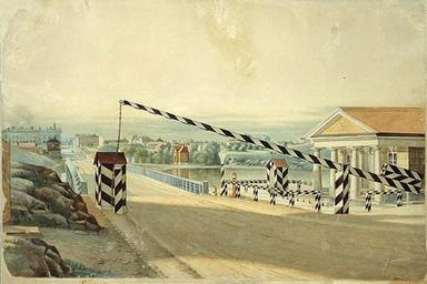 | Keywords: Tavasttull.jpg en Häme customs post at north end of Pitkäsilta Watercolour Roads leading to Helsinki ended at customs posts at the borders of the city These were the Häme customs post at the main bridge of the Vironniemi peninsula the location to which Helsinki was moved in 1640 and originally situated on the south side of the bridge and the Espoo customs post which was still in the 1700s situated at the Market Square end of what is now the South Esplanade During the time of Russian rule the customs posts were equipped with a barrier and sentry box as there were Russian soldiers in Helsinki at the time sv Tavasttull i norra ändan av Långa bron Akvarell Vägarna till Helsingfors hade tullar vid stadsgränsen I staden som 1640 flyttats till Estnässkatan fanns Tavasttull som först var i södra ändan av bron och Esbo tull som ännu på 1700-talet fanns vid Salutorget i ändan av nuvarande Esplanaden Under ryska tiden försågs tullarna med bom och vaktkur eftersom det fanns ryska militärer i Helsingfors fi Hämeen tulli Pitkänsillan pohjoispäässä Akvarelli Helsinkiin vievät tiet päättyivät kaupungin rajalla tulliin Niitä olivat Hämeen tulli Vironniemelle 1640 siirrettyyn Helsinkiin johtavan sillan luona aluksi sen eteläpuolella ja Espoon tulli joka vielä 1700-luvulla sijaitsi nykyisen Esplanadin Kauppatorin puoleisessa päässä Venäjän vallan aikana tullit varustettiin puomilla ja vartiokopilla koska Helsingissä oli venäläistä sotaväkeä http //www hel2 fi/kaumuseo/kokoelmat/svenska/taide/taide02 html Creator Magnus von Wright 1837 Magnus von Wright Finland in history paintings Watercolor paintings of landscapes Watercolor paintings of buildings Paintings from Finland Helsinki in the 1830s Customs services of Finland Sentry boxes in Finland PD-old-100 |